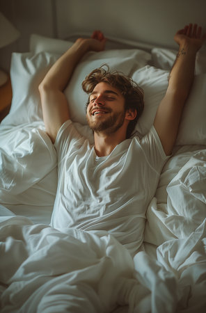 Start your day refreshed a handsome man stretches in bed, arms raised, yawning with ease