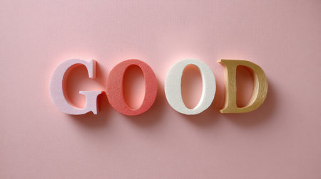 A vibrant arrangement of colorful letters spelling GOOD on a soft pink background, perfect for themes of positivity, encouragement, and creativity in design.