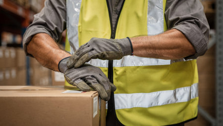 Hands Wearing Gloves Firmly Holding Cardboard Container Carefully During Packing, Proper Safety Measures Including Gloves And Careful Grip During Packaging Operations Ensure Safety
