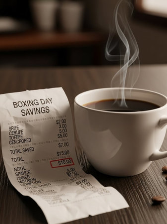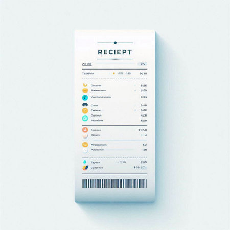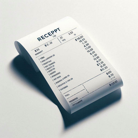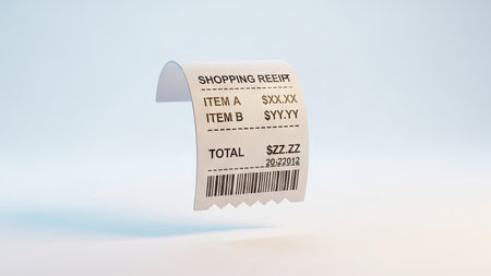 A close-up captures a shopping receipt against a softly lit background. The receipt displays item details and totals. The image presents a clean composition with focus on the paper texture. This image is suitable for illustrating consumerism, finance, or retail transactions in various commercial applications.