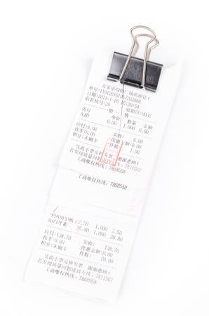 Close up of a receipt on a white background. Toned.