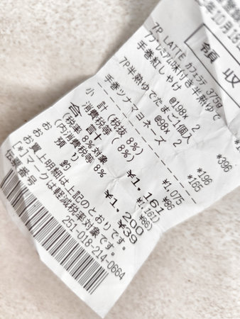 Tokyo, Japan on 20 Oct 2025. Detailed view of a Japanese receipt displaying purchase information and amounts, set against a textured background Use for business or financial concepts.