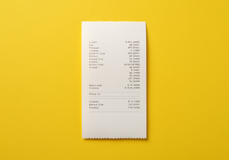 A close-up shot of a printed sales receipt with itemized details, laid flat on a bright yellow surface.