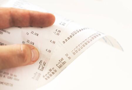 human fingers holding a paper receipt with the bill of charges and checking the total amount. Domestic finance. Tax receipt on a roll of thermal paper