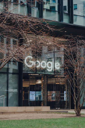 London, UK - January 01, 2022: Name sign above the entrance of Google offices in London. First Google office in the UK in opened in 2003 and has since grown to accommodate thousands of employees.
