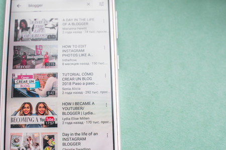 Minsk, Belarus - October 29, 2018: Youtube video service on smartphone screen close-up. Youtube service menu