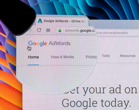 Sankt-Petersburg Russia December 7, 2017: Google Adwords homepage website on Apple iMac monitor screen under magnifying glass. Google AdWords is online advertising service.