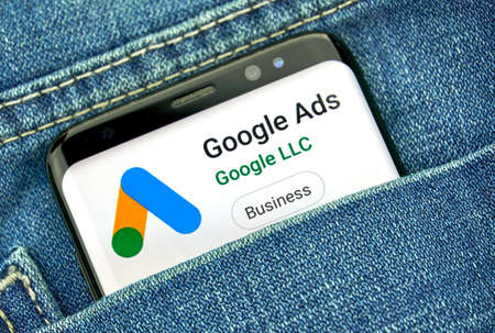 MONTREAL, CANADA - SEPTEMBER 30, 2018: Google Ads new logo and app on a Samsung s8 screen. Google Ads, formerly known as Adwords, is an online advertising platform developed by Google
