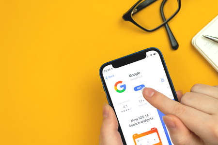 Kharkov, Ukraine - January 10, 2022: Google app icon close-up. Woman uses the application on Apple iPhone 12 mini