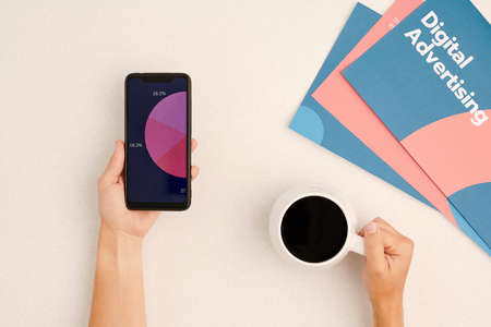 Flatlay of hands of contemporary businessperson having coffee and working