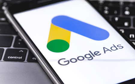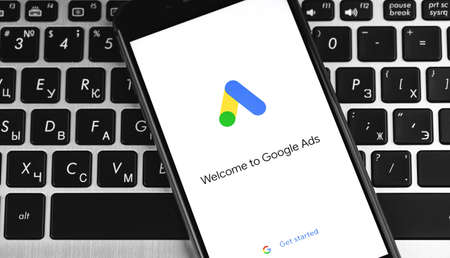 Google Ads (AdWords) logo on the screen iPhone, notebook keyboard closeup background. Ads is a service of contextual, basically, search advertising from Google. Moscow, Russia - December 19, 2019
