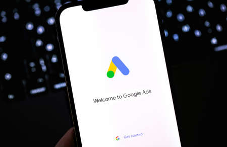 Google Ads logo on smartphone screen in hand.