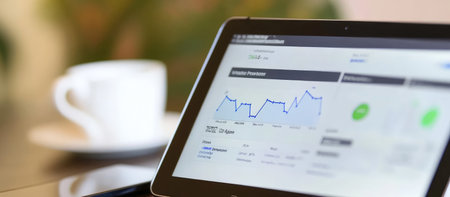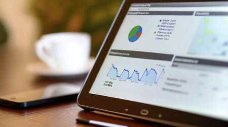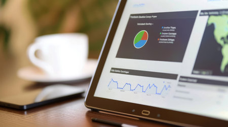 A fresh cup of coffee beside a tablet displaying business charts, reflecting productivity, analysis, and modern work environment.