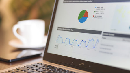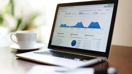 Laptop displaying financial data and charts on a desk with a cup of coffee, showcasing business analytics and reporting