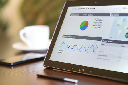 A close-up view of an analytical dashboard on a tablet showcasing various business metrics alongside a coffee cup and smartphone on a wooden table surface.