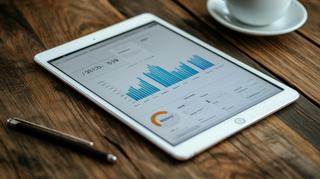 A sleek digital tablet showcases financial charts on a wooden table alongside a cup of coffee and a pen, perfect for business and analytics imagery.