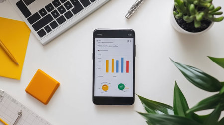 A mobile device showcases colorful bar graphs and analytic charts on a modern desk filled with office supplies and a vibrant green plant, emphasizing productivity and organization.