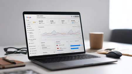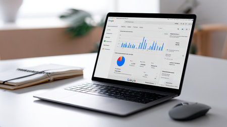 A modern laptop showcases various data visualizations in a bright office setting. The clean layout emphasizes productivity and digital innovation in a professional space.