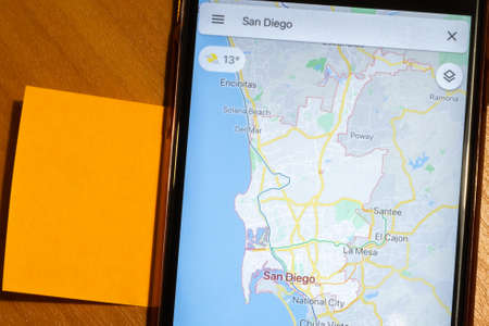 Saint-Petersburg, Russia - 10 January 2020: Map of San Diego city on phone screen close-up top view with copy space. Tourism concept, Illustrative Editorial.