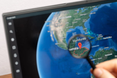 New York, USA - July 11, 2023: Zooming on Honduras country through magnifying glass on screen of google earth close up view