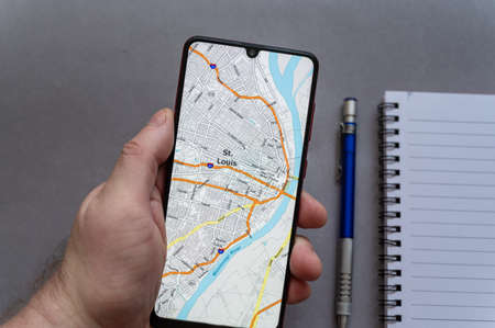 A man is holding a smartphone in his hand. A map of the city of St. Louis on the screen of the device. Notebook and pencil in the background. Planning a trip to Missouri concept. selective focus.