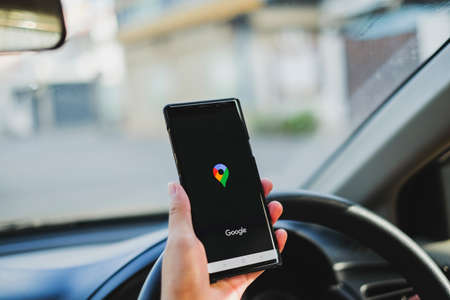 Bangkok Thailand- April, 03, 2021 : Google Maps navigation on smartphone in car. Google Maps is most popular mapping service for mobile provided by Google.