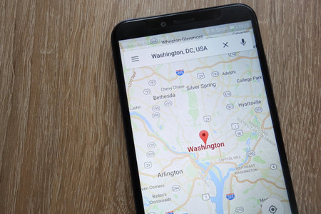 KONSKIE, POLAND - JUNE 17, 2018: Washington DC location on Google Maps app displayed on a modern smartphone