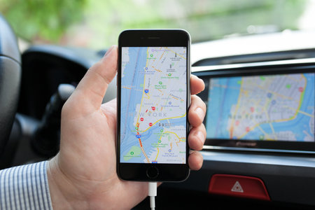 Alushta, Russia - May 31, 2016: Man hands holding iPhone 6 with Apple Maps in the screen and Car Play on the multimedia system. iPhone, Apple Maps and Car Play was created and developed by the Apple inc.