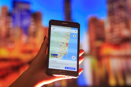 Map of Florida on the phone in the background of a night city. Close Up Of Woman Hand Holding Mobile Phone