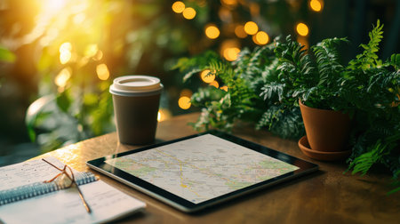 Coffee cup and phone on the table with map background.