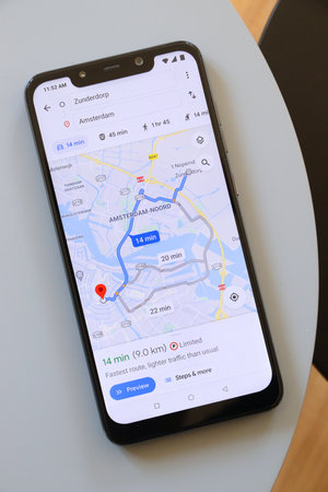 WARSAW, POLAND - APRIL 21, 2020: Google Maps app view route directions in Amsterdam displayed on a Xiaomi F1 Pocophone Android smart phone.
