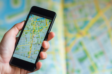 Closeup shot of modern smartphone with GPS application showing map of city
