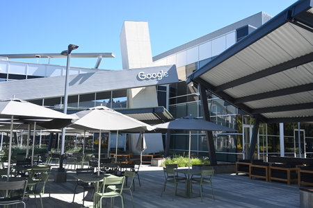Mountain View, California, USA - August 13, 2018: Exterior of a Google headquarters building. Google technology company leader in internet services, online advertising, search engine, cloud computing.