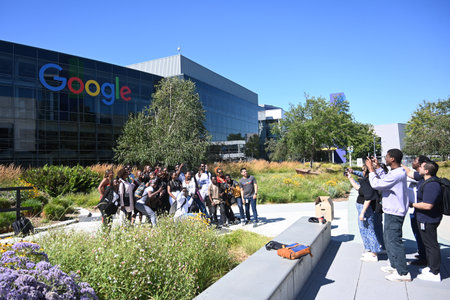 Mountain View, CA, USA - July 28, 2023: People near the Googleplex headquarters complex of Google and its parent company at 1600 Amphitheatre Parkway in Mountain View.