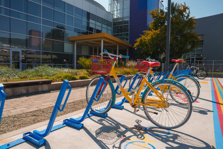 Mountain View, CA, United States - August 13, 2018: colorful bike for Google employees to move in Googleplex Headquarters. Google is an American technology company that specializes in Internet services