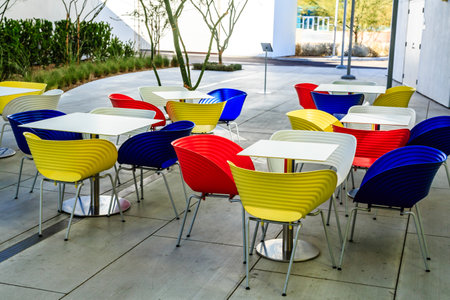 A row of colorful chairs and tables are arranged in a courtyard. The chairs are in various colors, including red, yellow, and blue, and the tables are white. The scene gives off a lively