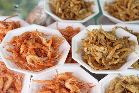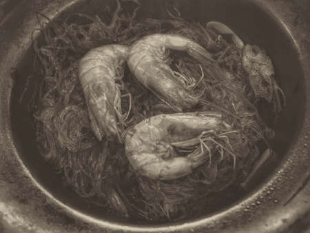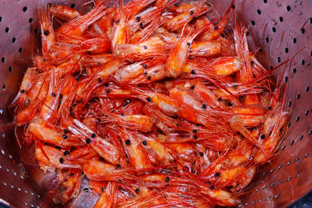 Fresh prepared asian spicy steamed prawns on market in Krabi. Traditional thai cuisine made of fresh ingredients.