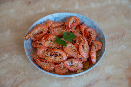 Cooked Atlantic shrimps. Close up. A traditional food of coastal cuisine