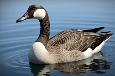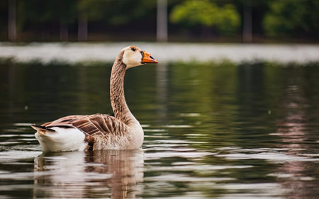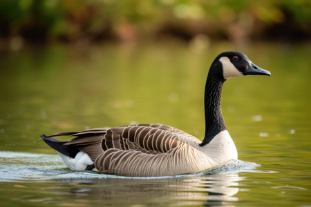 Elegant canadian goose glides smoothly on a serene lake with lush greenery background