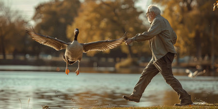 Elderly man playing with a duck in the park in autumn
