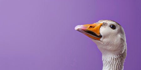 A funny goose peeks out on a purple background. Copyspace, place for text. High quality photo