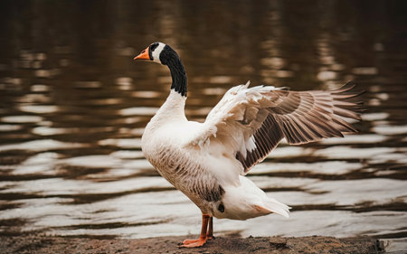 Beautiful white goose standing on the river bank with spread wings.