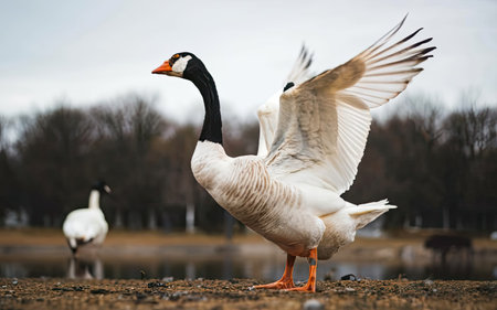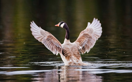 Adult canada goose (Branta canadensis) with wings spread out in Wausau, Wisconsin during the spring, horizontal