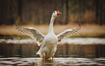 A majestic goose spreads its wings over a misty lake at dawn, capturing the serene beauty of wildlife in a tranquil setting with vibrant autumn colors.