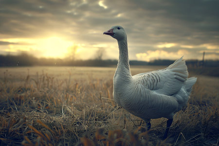 white goose standing on the field with copy space