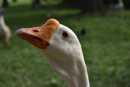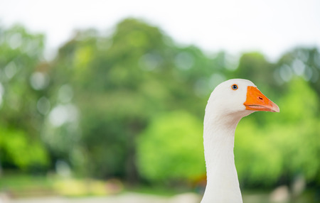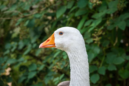 Domestic goose, Anser cygnoides domesticus, in profile. Domesticated grey goose, greylag goose or white goose portrait on green blured background