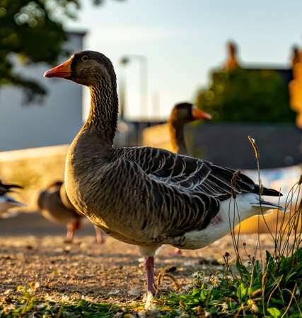 Goose standing on a green meadow in the sunlight at sunset