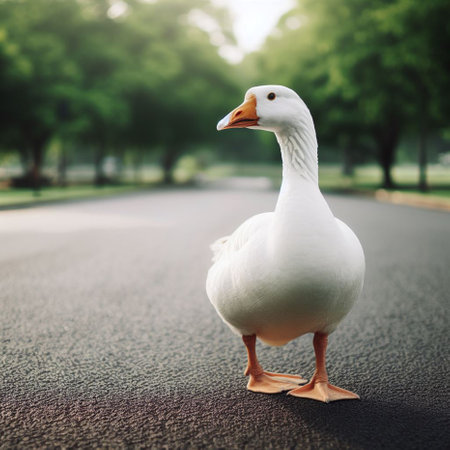white goose walking on asphalt road in the park, vintage color tone