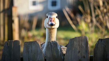 A curious goose peers over a rustic wooden fence, showcasing its distinct features and vibrant colors. This charming bird captures a serene rural moment.
