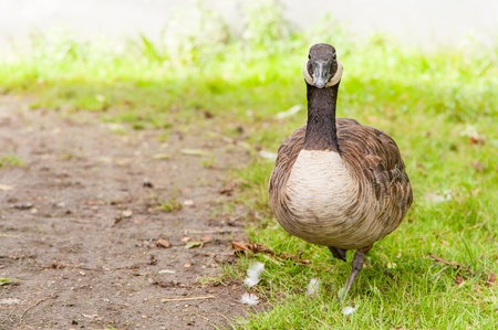 Portrait of a malicious goose against a green grass